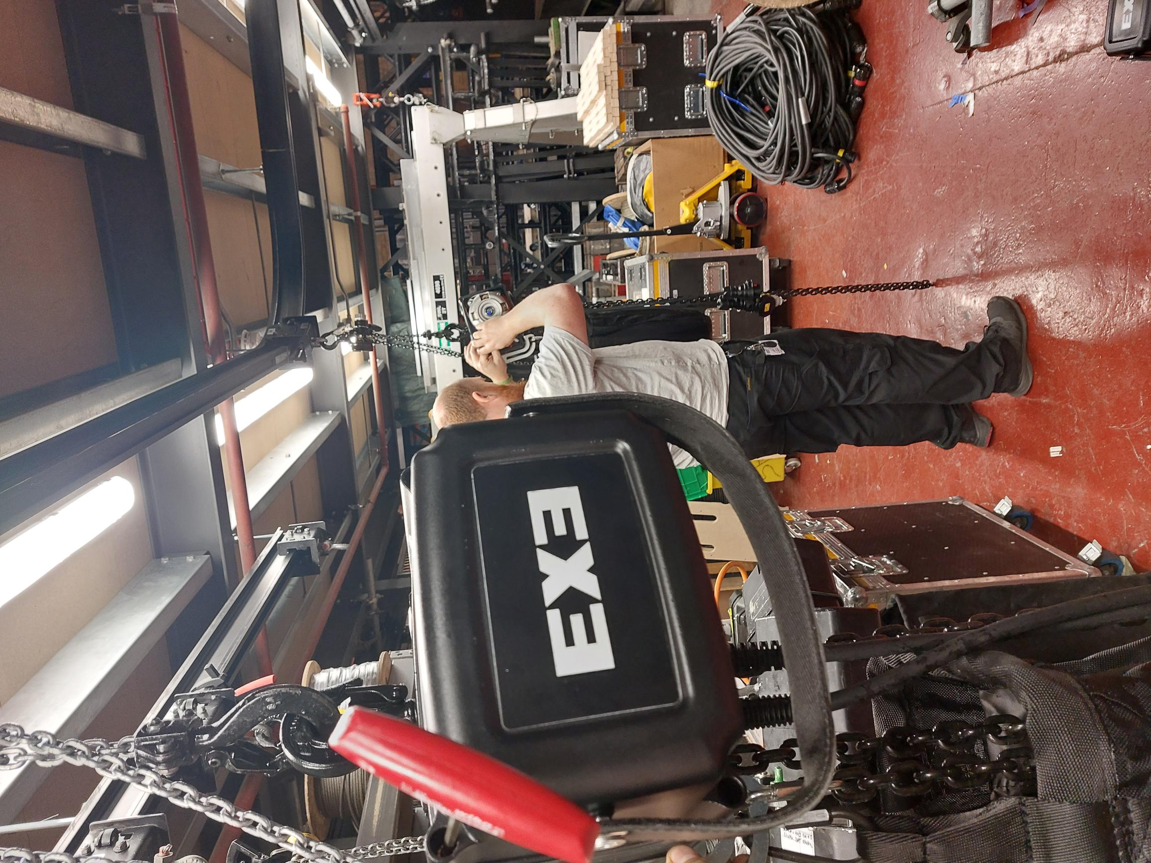“The rigging department at the National Theatre are fantastic to work with, their technical astuteness and out of the box thinking created a great collaboration that resulted in different chain hook attachments for some of their EXE Rise fleet. The modification was required to enable the hoists' chain to be passed through the grid in a venue and a solution was found utilising alternative chain attachments of appropriate size. The EXE Medium frame 350Kg units were selected due to their size-to-weight ratio, which perfectly suited the confined spaces in the grid loft, allowing for ease of installation and manoeuvrability once inside the grid space.”