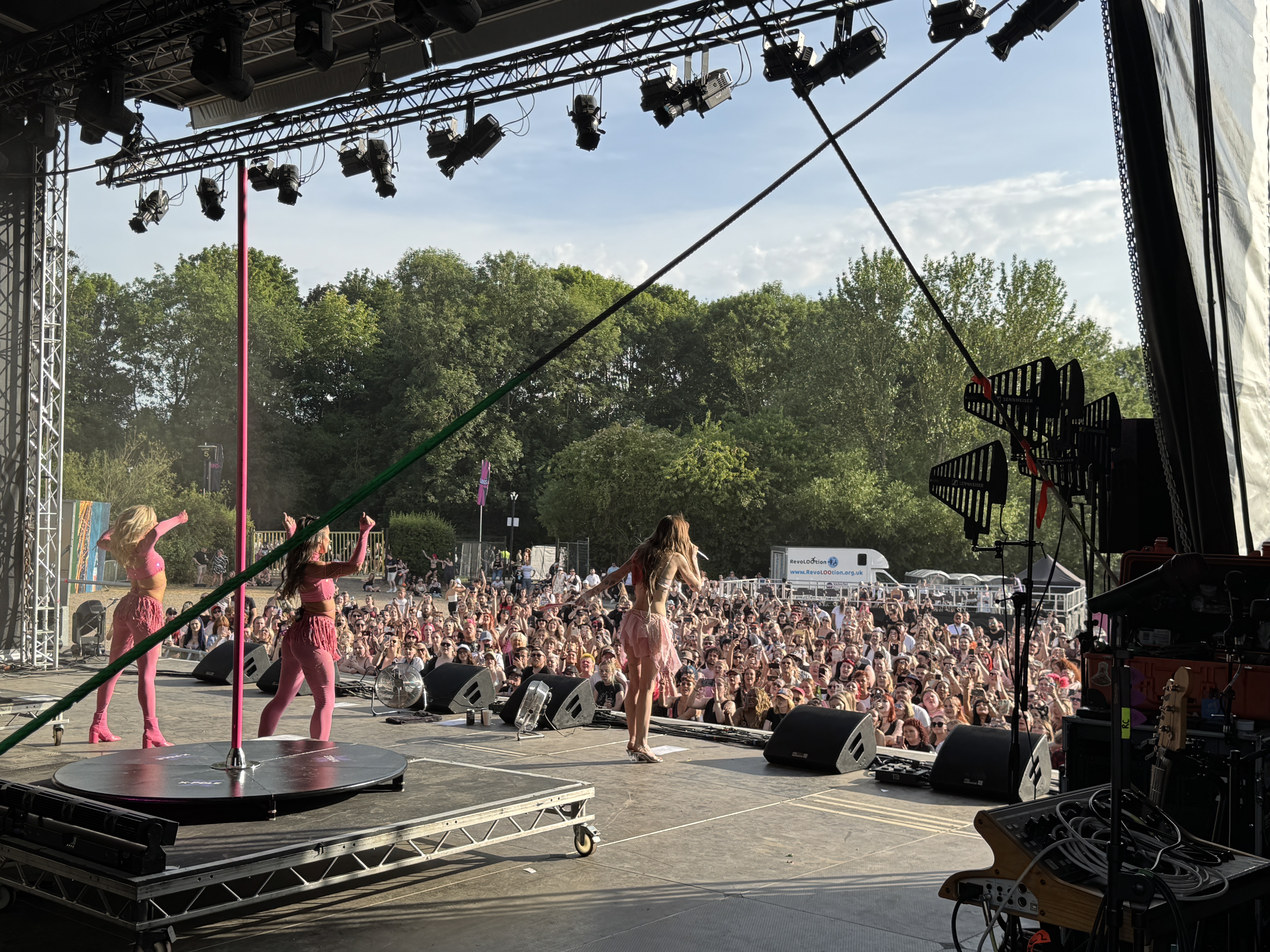 Stage 2 entertainment was provided on the MILOS MR2K roof structure with its low-profile Keder canopy and versatile horizontal truss grid layout for maximum rigging solutions which comply with the latest EuroCode specifications. The benefits for temporary event structures include integration with existing ground support, robust construction, while providing the ability to adapt to various event needs and perfect for this back-to-back event. Key advantages include efficient rigging time with MT1 M290 truss towers, while the low-profile design ensures easy installation, constructed on a Layher base. The MILOS MR2K utilises MILOS MT1 towers with horizontal M390 truss grids, respectively providing a strong and stable platform for rigging sound, lighting, video screens and other equipment.